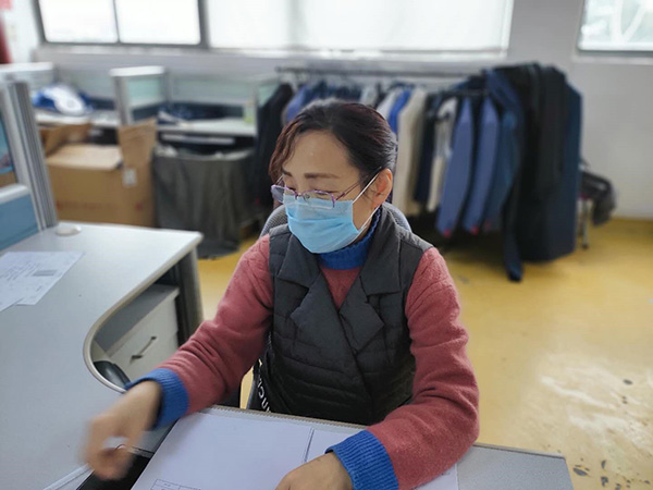 生產任務更艱巨,面料顏色要求比較特殊,而目前防護材料又是全球緊缺物資,因此,解決3月1日上午出運的3.8萬件面料問題,最為關鍵。老黨員顧彩紅再次自動請纓,挑下采購面料的重擔。